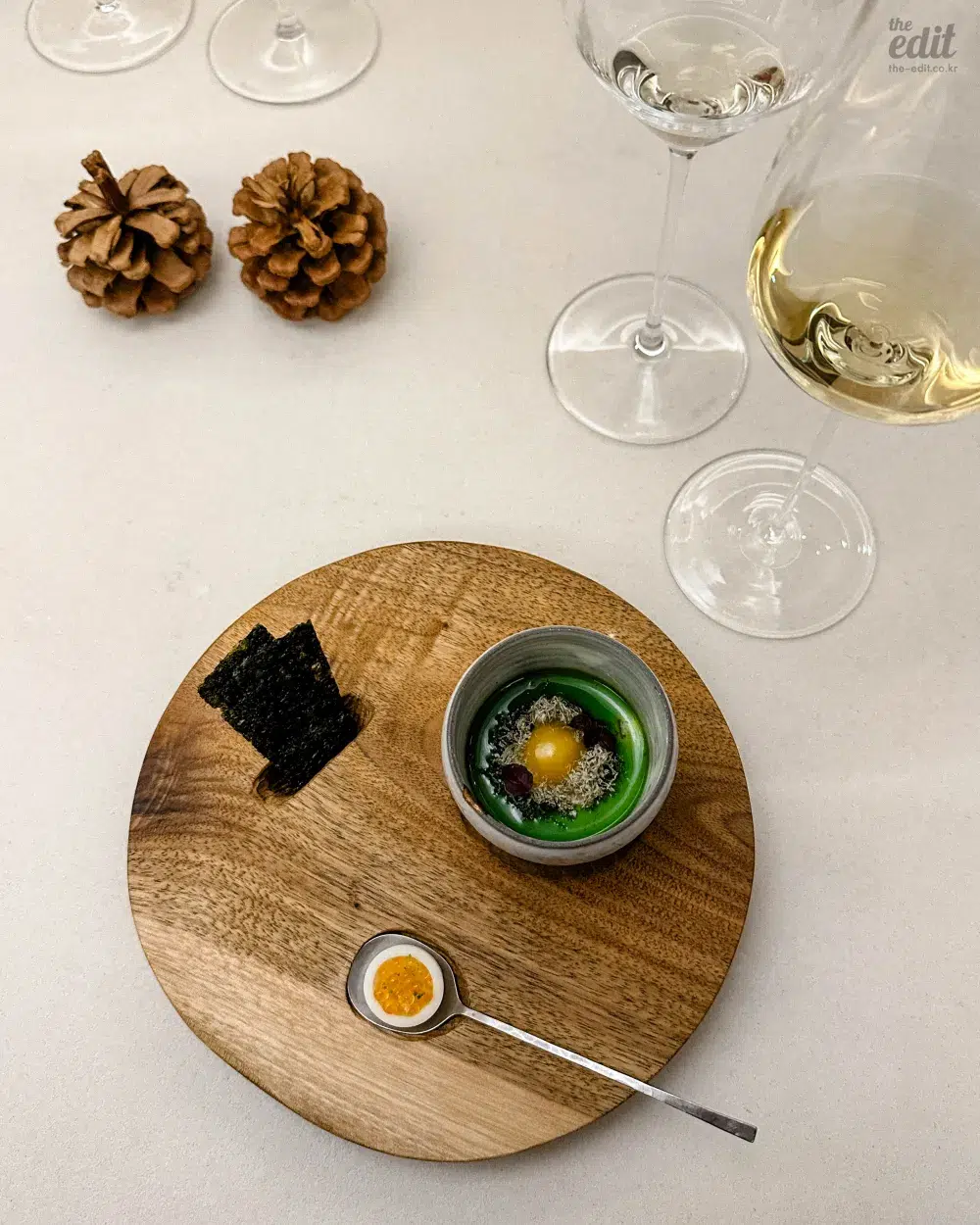 솔밤은 볼거리에도 목숨을 건다. 우리 레스토랑에 온 모든 손님들의 인스타 스토리를 촘촘히 바느질하겠다는 야심이 가득하다. 가장 빛나는 디쉬는 단연 ‘솔밤의 드로잉 룸’. 작은 함에 한치와 닭간, 단새우를 촘촘하게 새겨넣고, 딜오일로 마무리한 것은 황후의 보석함을 떠올리게 만든다. 메추리알에 훈제 연어알을 정렬해 놓은 모양새라든가, 숟가락을 뉘일 자리, 김을 꽂은 자리마저 딱 맞게 조각해둔 건 좀 변태 같기도 하다. 봉테일이 울고갈 솔테일이라는 말이 절로 나온다. 그래서 솔밤에 올 때는 시간을 넉넉하게 잡기를 추천한다. 보면서 감탄하느라 식사 시간이 계속 길어질 수밖에 없으니.