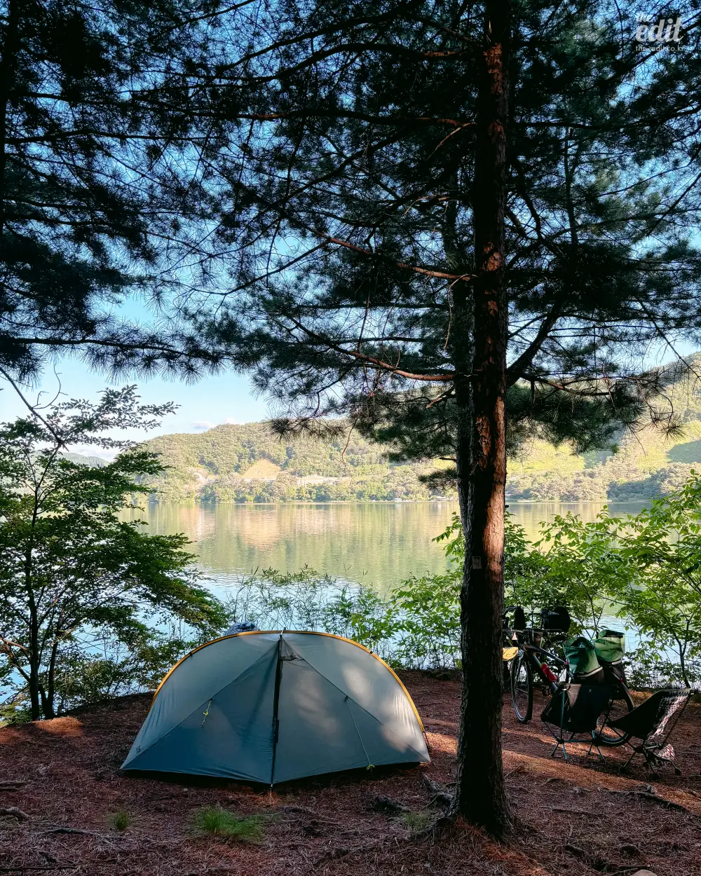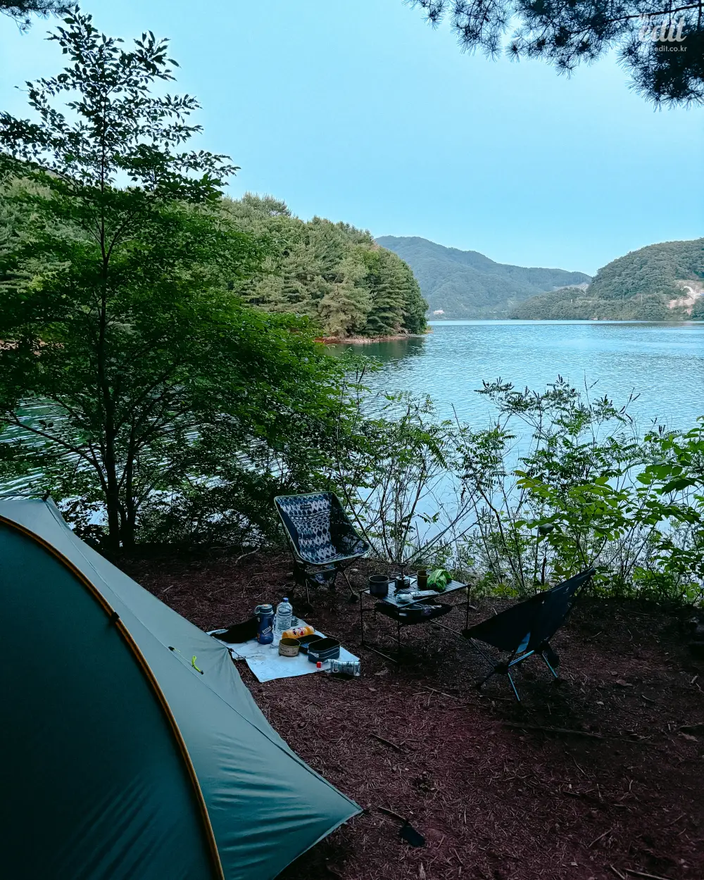 뷰는 확실하다. 그 유명한 춘천호를 앞에 두고 빽빽한 잣나무 숲속에서 야영할 수 있다. 조용한 숲에서 물멍하며 가만히 앉아 있다 보면 일상과 완전히 분리되는 경험을 할 수 있다. 이 호수에는 깨끗한 물에서만 사는 수달 등의 멸종위기 야생동물들도 있다.