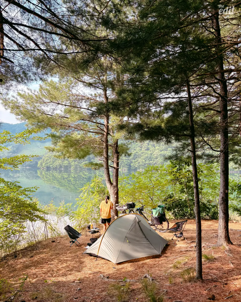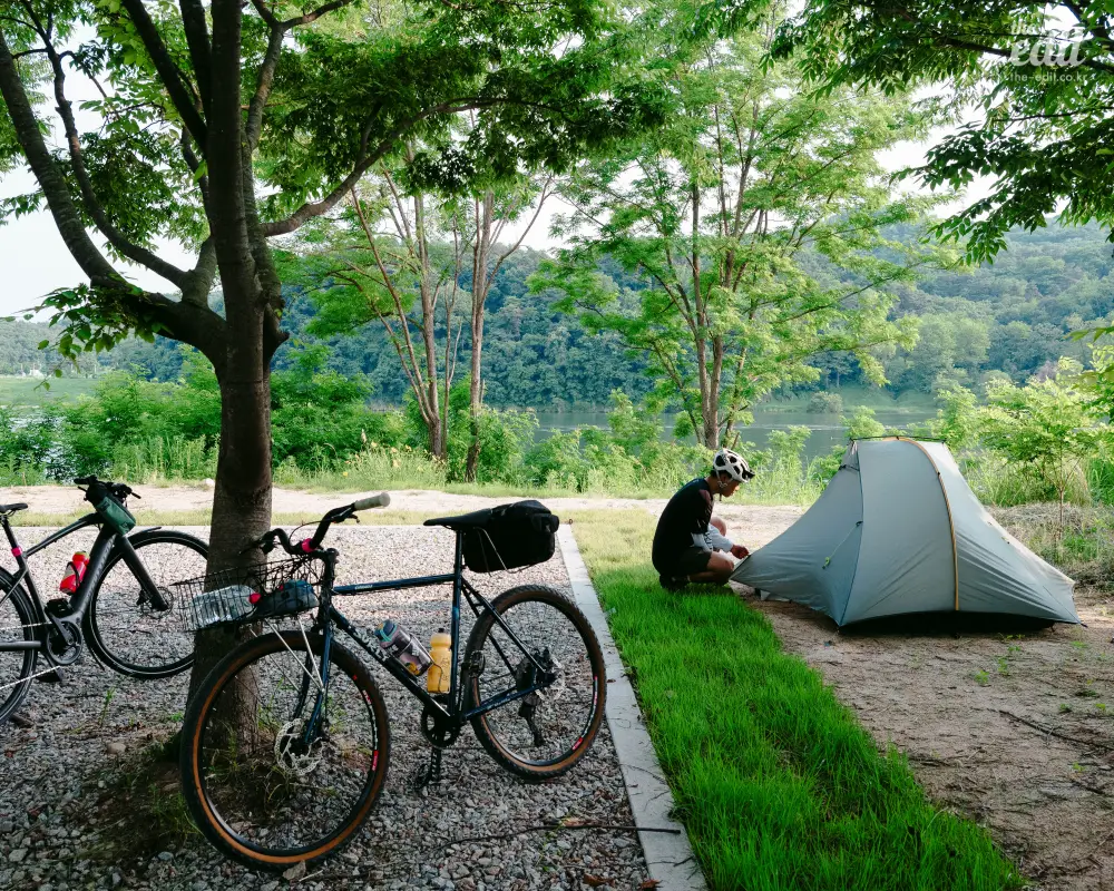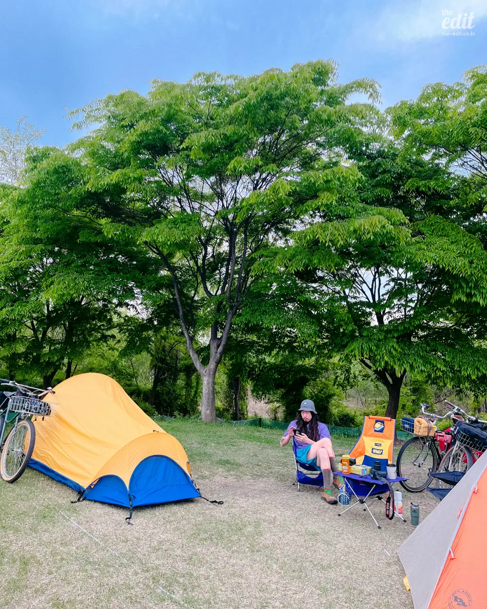 서울 근교 드라이브 코스로 유명한 그 강천섬 유원지다. 시설이 깨끗하고 공원이 넓어 인기 있는 백패킹 스팟이었는데, 2024년 12월부터 정식 캠핑장으로 운영하고 있다. 주차장부터 유원지까지는 약 800m. 수레나 백팩에 짐을 담아 다리와 산책로를 건너 캠핑 구역으로 넘어오면 된다. 조금 걸어야 하지만, 차 없이 너른 공간에서 야영할 수 있어 오히려 좋다. 지금은 이미 다 떨어졌겠지만, 강천섬은 원래부터 가을 단풍 명소로 특히 유명하다. 억새길과 은행나무 거리를 지나 북한강 경치를 앞에 두고 텐트를 쳐보자. 남한강 자전거길이 지나는 길에 위치하고 있어 서울에서 자전거를 타고 오는 코스도 추천.