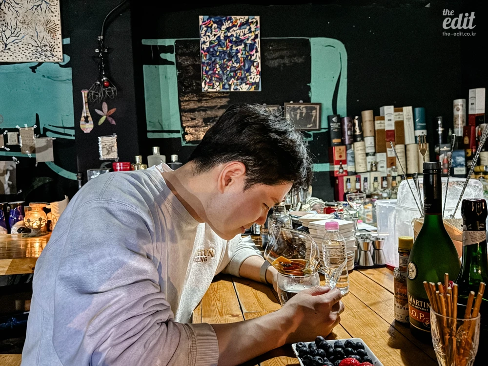 “첫 잔은 진 베이스였으니까 이번에는 진 말고 다른 걸로 하고 새콤달콤했으면 좋겠어요. 도수는 중간정도로요.”