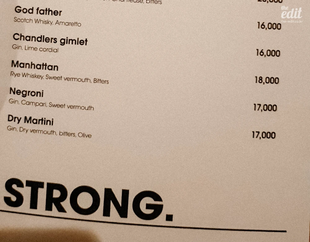여럿이 방문한 경우, 메뉴판을 꼼꼼히 들여다보며 하나씩 주문하기엔 시간이 너무 오래 걸릴지 모른다. 그럴 땐 바마다 한두 개 쯤은 있는 시그니처 칵테일로 시작해보자. 공들여 만드는 메뉴다보니 맛도 비주얼도 실패할 가능성이 적다. 게다가 시그니처 메뉴에 걸맞은 자세한 설명은 보너스라, 맛을 충분히 느껴며 마시기도 좋다.