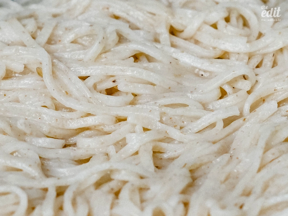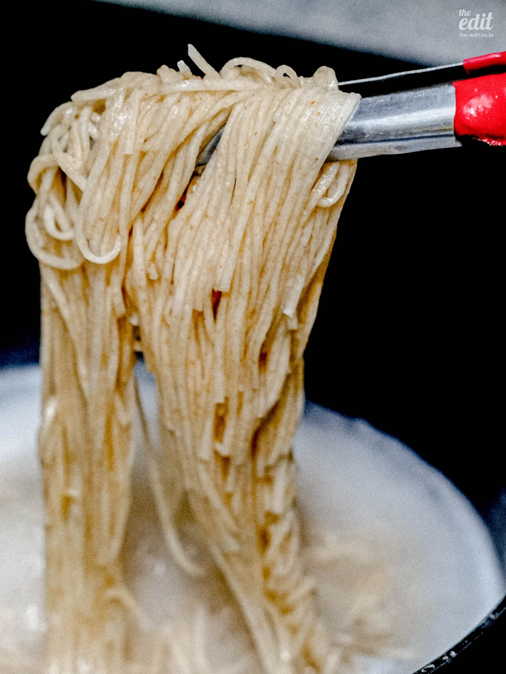 주목해야 하는 레시피 포인트는 면 삶는 시간이다. 다른 파스타 면보다 삶는 시간이 짧다. 2~3분 안팎이면 냄비 안에서 충분히 익는다. 오래 삶으면 밀가루 반죽이 서로 뭉치며 떡진 수제비처럼 변하니 조심해서 다뤄야 한다.