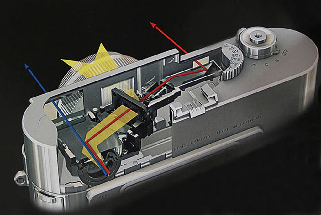 기존의 라이카 M 카메라를 보면 두 개의 구멍이 양쪽에 있는데요. 하나는 뷰파인더, 다른 하나는 레인지파인더 창입니다. 뷰파인더로 보는 기본적인 형상 위에 레인지파인더 창에서 보이는 상을 중앙부만 잘라서 뷰파인더에 내장된 반투명 거울을 통해 이중으로 보이게 한 후, 렌즈의 초점을 조정할 때 레인지파인더 쪽에 연결된 렌즈 중 하나가 같이 움직이면서 이 두 개의 상이 합쳐질 때 초점이 맞는 방식입니다. 이중 합치 방식이라고도 하죠.