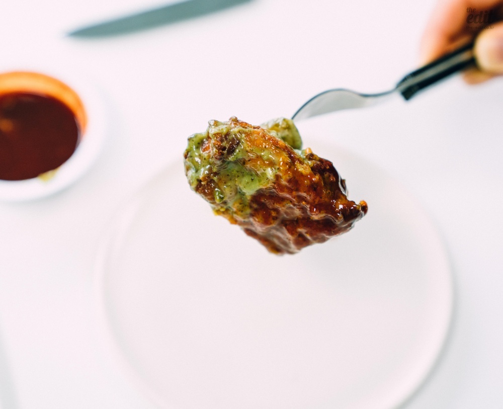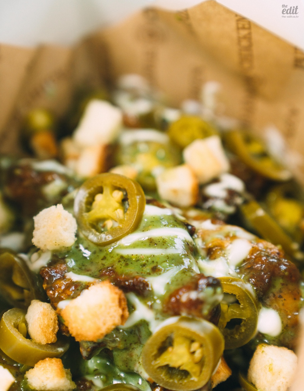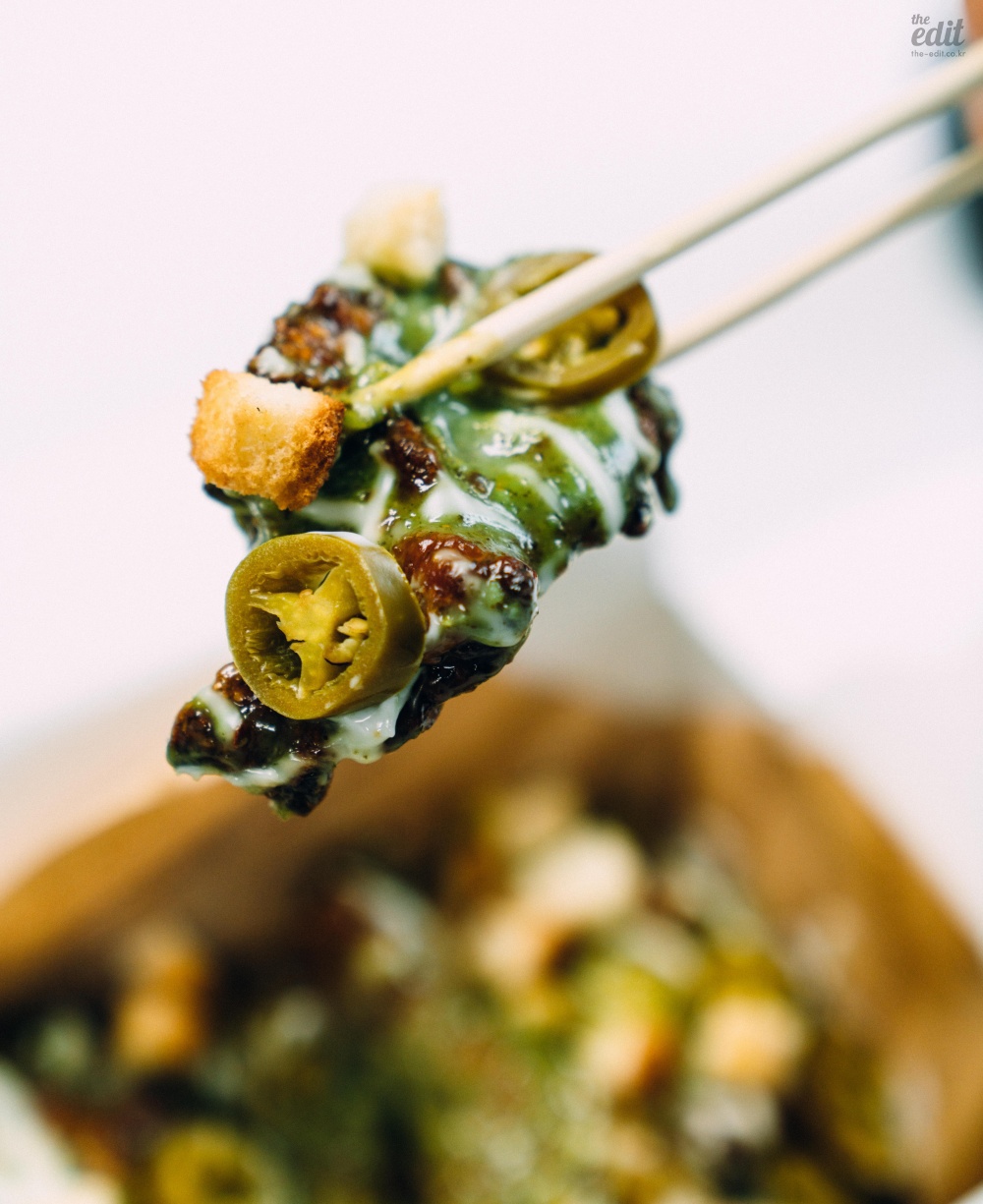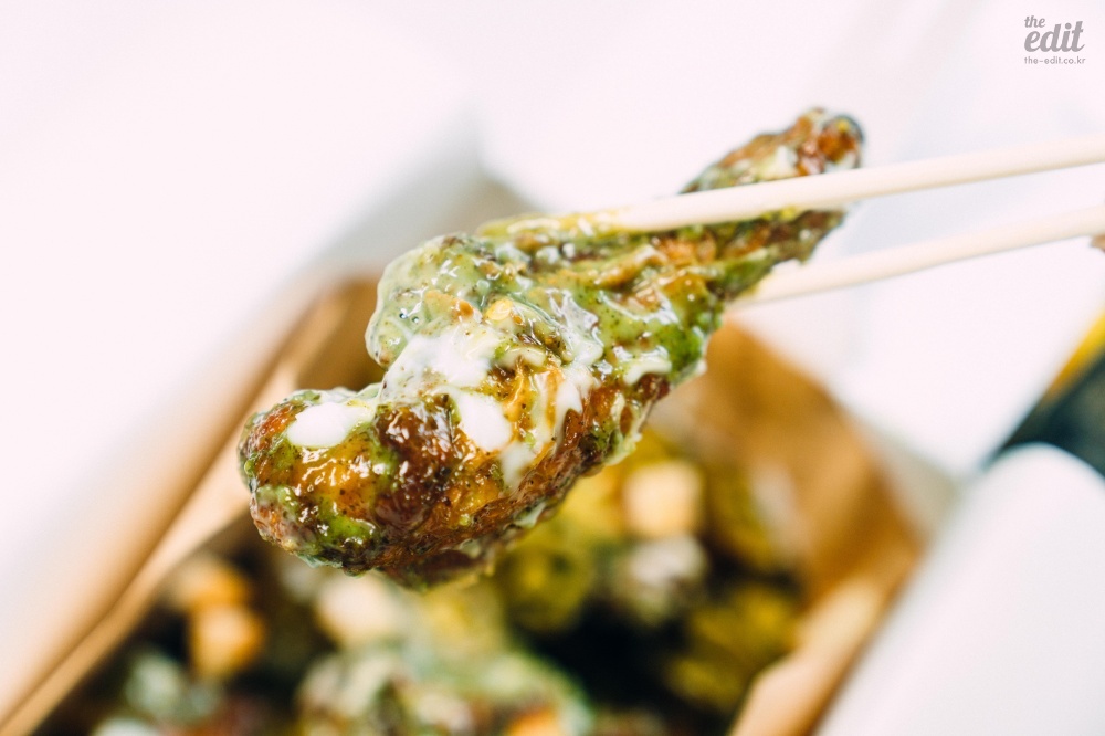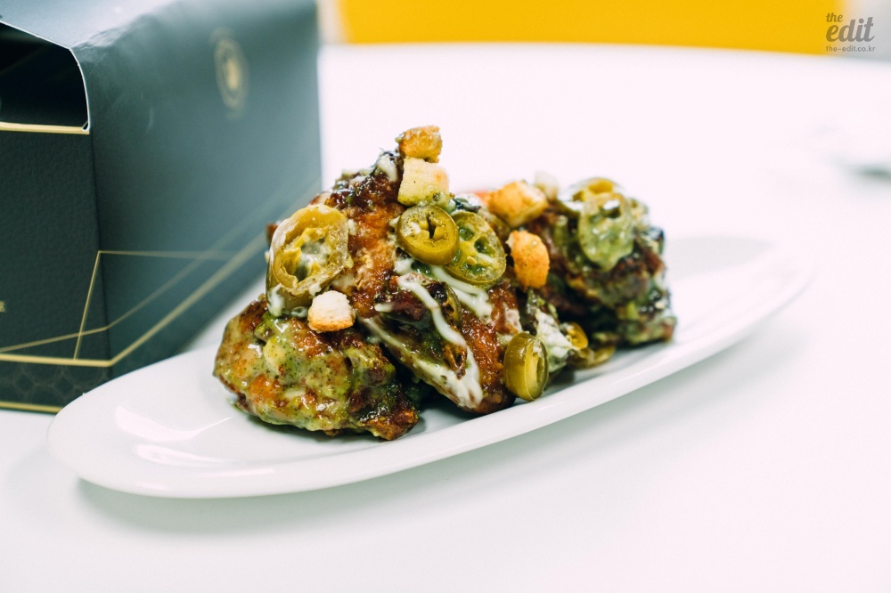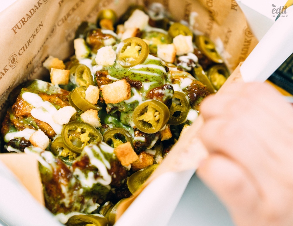 가까이에서 찍은 컷도 보여드릴게요. 푸라닭 공식 보도자료에서 조금의 설명도 없지만 바질이 들어갔습니다. 구성을 보면 마요와 바질을 섞은 소스에 할라피뇨와 크루통을 토핑으로 올렸습니다. 설명만 들어도 맛의 구조가 탄탄할 것 같죠? 먹어 보면 밸런스가 아주 좋습니다. 마요의 달고 기름진 맛, 크루통의 식감, 할라피뇨의 매콤한 맛에 바질이 풍미를 더해줍니다. 사실 치킨 중에 이렇게 여러가지 맛을 내려고 하는 치킨은 드뭅니다.