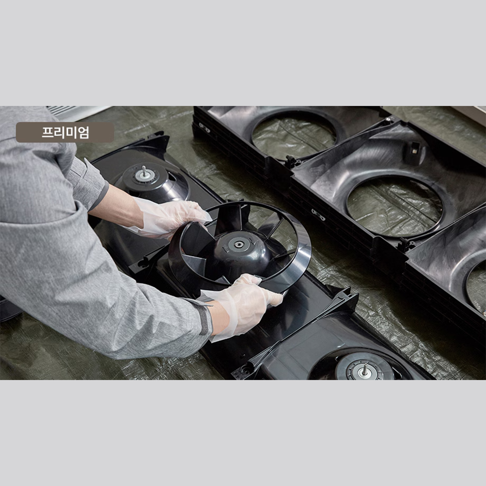 - 제품 분해 및 세척: 본체를 열어 열교환기와 냉방 팬을 분해하고, 열교환기는 고압세척 처리한다. (프리미엄과 라이트플러스에 따라 상이)