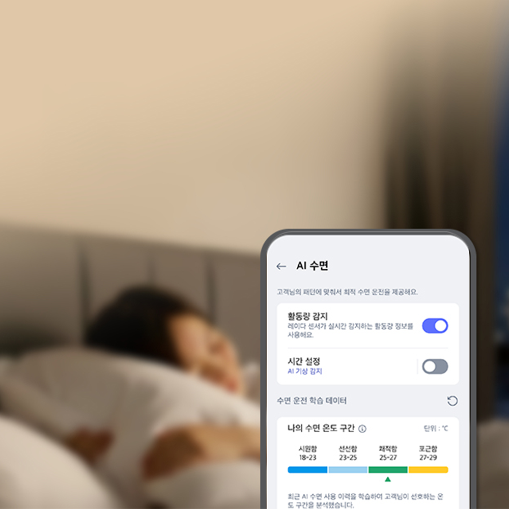 [AI 수면 만족도] * 시험 일시 : 2026.01 * 시험 기관 : 자사 에어컨 주택환경 시험실 (18.0m2 주거환경 모사, 천고 높이 2.4m) * 시험 모델 : FQ25GN9BEN * 시험 조건 : 실내 DB(30±0.5)℃, WB(22±0.5)℃ / 실외 DB(30±0.5)℃, WB(22±0.5)℃, 설정온도 26℃ * 시험 방법 : 자사 스탠드 AI 수면 모드로 운전(총 운전 시간 7시간), 재실 영역의 온도, 유속 측정 후 온열감 산출하여 수면 쾌적감을 계산하였습니다. – 온열감 산출(ISO 7730 PMV equation) : 온도, 습도, 유속, 복사온도(측정값), 수면 쾌적감 : 수면 시 침구 착의량을 고려한 PMV 계산식으로 도출, 착의량(1.37clo: 침구 착의량, 일본 Kansai Univ.에서 공동연구 진행하여 취득한 값) – 활동량(0.7MET: 누운 상태 사용) * 시험 결과 : 전체 시간 동안의 수면 쾌적감 91%, 수면쾌적감 지수: 80% 이상: 매우 쾌적, 60~80%: 보통, 60%미만: 불쾌적, 참조구격 : 미국냉동공조학회 ASHRAE standard 55 * 시험실 측정 결과 기준이며 실 사용환경에서는 달라질 수 있습니다.