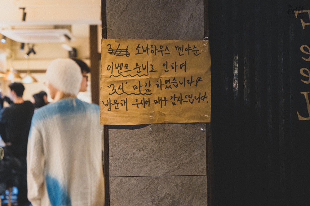 3월 27일 금요일 저녁 7시 30분, 소바하우스 멘야준에 도착했다. 외관은 평소와 크게 다르지 않았다. 다만 가게 앞에는 캠핑 체어를 펴고 웨이팅하는 손님이 둘 있었고, ‘오늘은 대관 행사로 입장이 어렵다’는 안내문이 붙어 있었다. 문을 열고 들어가자 익숙한 장면이 펼쳐졌다. 오즈모 포켓을 들고 있는 푸드 유튜버, 노트북으로 영상을 편집하는 인스타 매거진 에디터, 그리고 소수의 연예인들. 나는 안내받은 자리에 앉아 시오라멘을 하나 주문했다. 메뉴는 쇼유와 시오, 두 가지였고 1인 1메뉴만 가능했다.