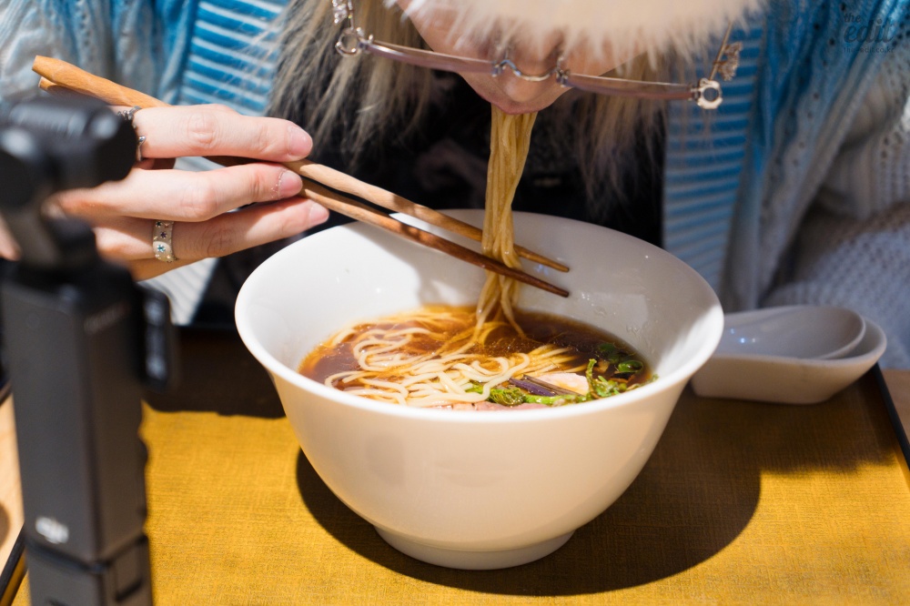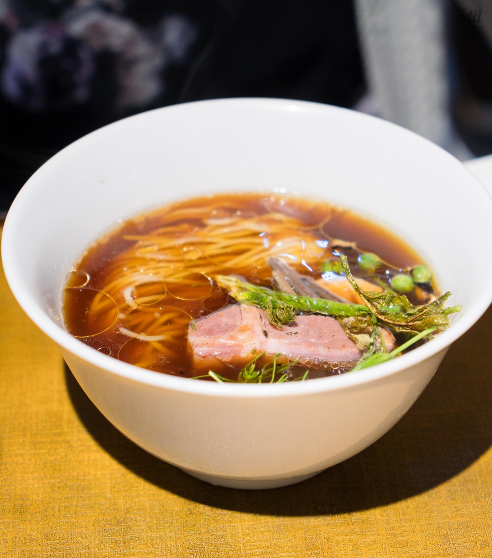 “쇼유라멘은 베이스 육수는 시오라멘과 같고, 조금 더 단단하게 하기 위해서 등뼈를 조금 더 많이 넣었어요. 조금 더 묵직한 육수를 준비해드렸습니다. 땅두릅을 올렸는데, 그냥 올리지 않고 덴푸라 느낌으로 튀겨서 올렸고, 그 외에는 세발나물, 비장탄에 구운 목살, 등심, 앞다리가 있습니다. 또, 일본 라멘에는 기본적으로 멘마가 많이 들어가는데 멘마 대신에 한국 식재료인 고사리를 이찌방다시에 담가서 맛을 냈습니다. 간장 맛만 나는 게 아니라 고추도 들어가서 미세하게 매운맛이 납니다. 거의 4일 동안 잠을 잘 못 자고 계속 준비했어요. 한 그릇이지만 정말 시간을 많이 들여서 정성껏 준비했으니 잘 즐겨주시면 감사하겠습니다.”