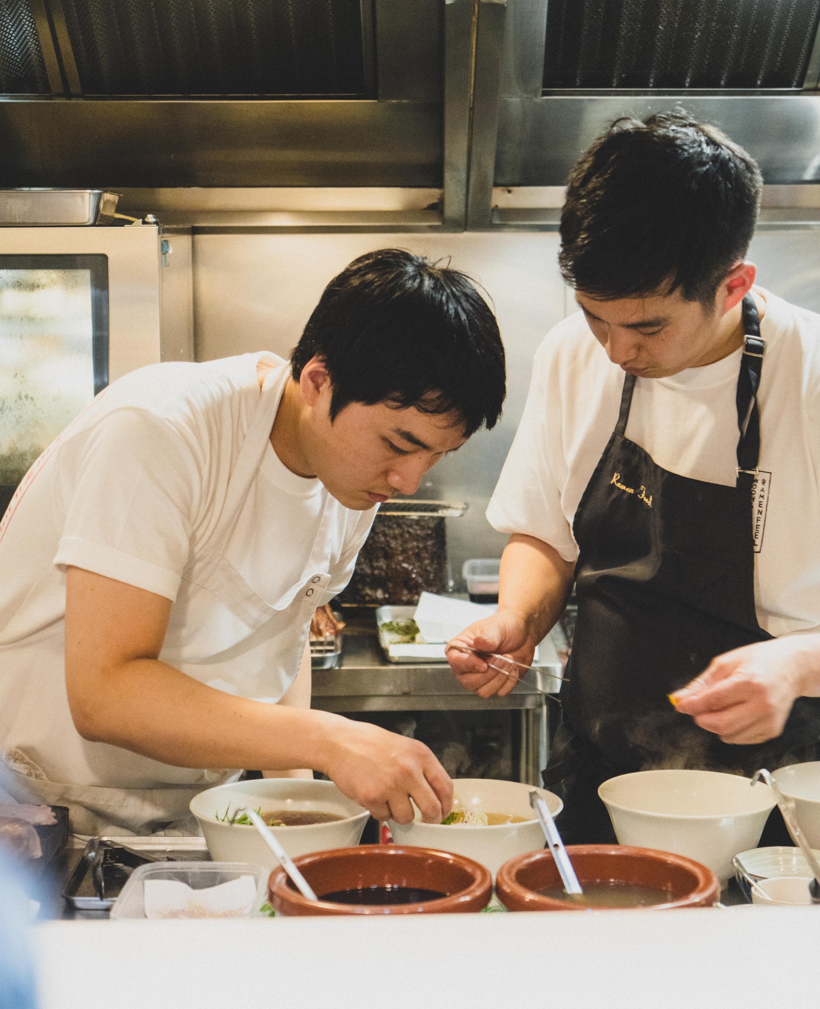 그리고 한 가지 더, 라멘필을 한국에서 맛볼 수 있다는 점도 기대를 불러 일으키기에 충분했다. 라멘필은 2021년 도쿄 오메시에 문을 연 라멘 전문점이다. 현재는 문을 닫았기 때문에 그 가게의 라멘을 먹는 방법은 없다. 라멘필의 셰프 와타나베 다이스케는 라멘 경력 11년차로 현재 새로운 라멘의 가능성을 찾기 위해 몇 년 동안 공부 중이며, 일본에서 가장 예약하기 어려운 라멘집 ‘이이다 쇼텐’에서 4년 반을 수련한 뒤 독립한 유일한 졸업생이기도 하다. 한국에는 한 번도 와본 적이 없었지만, 여러 번 찾아온 웅성을 보며 이번 팝업을 결심했다고 했다. 한편으로는 꽤 오랫동안 웅성을 ‘멘야준’의 오너로 착각할 정도로 말이다.