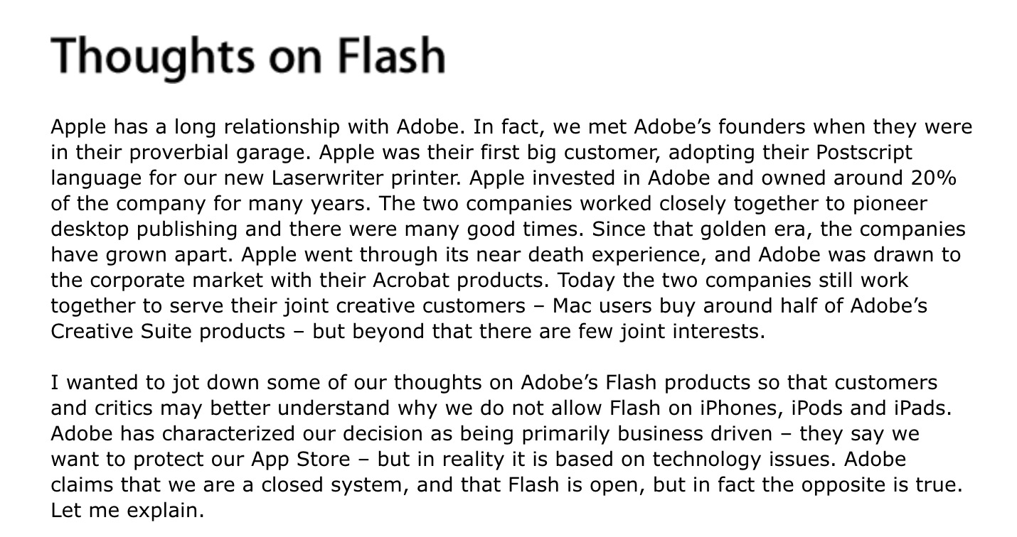 이에 스티브 잡스는 애플 홈페이지에 ‘플래시에 대한 생각’이라는 글을 올렸습니다. 먼저 어도비가 창업된 순간부터 애플은 한때 어도비 주식의 20%를 소유하는 등 긴밀한 관계를 유지해 왔다는 것을 강조하면서도, 성능과 전력 소모, 보안 문제, 그리고 어도비만의 독점적인 기술이라는 점을 들며 아이폰과 아이패드에 플래시를 탑재할 생각이 없음을 분명히 했습니다. 잡스는 편지를 “어도비는 과거를 뒤로 한 애플을 비판하는 데 힘을 쏟기보다, 미래를 위한 훌륭한 HTML5 도구 개발에 더 집중하는 게 더 나을 겁니다.”라는 강한 어조로 마무리했습니다.