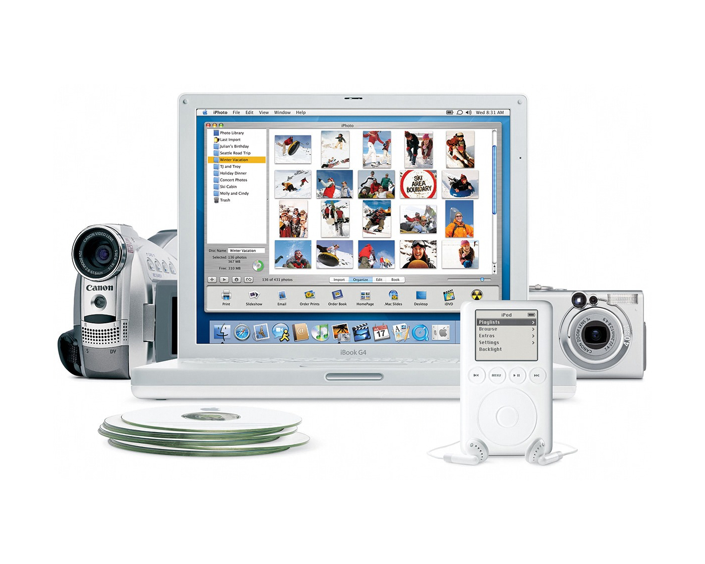 2001년에 애플은 ‘디지털 허브’ 전략을 선보였습니다. 디지털카메라와 캠코더, MP3 플레이어 등 다양한 기기들을 연결하는 중심에는 디지털 허브, 즉 맥이 있다는 것이었죠. 이 전략의 일환으로 애플은 아이무비와 아이튠즈 같이 다양한 기기들과 소통할 수 있는 소프트웨어를 개발하면서도 직접 MP3 플레이어를 개발하기로 합니다. 당시 MP3 플레이어는 MP3 파일을 재생할 수 있는 MP3 CD플레이어와 64~256MB 정도 용량을 탑재한 플래시 메모리 플레이어, 아니면 노트북용 하드디스크를 탑재한 HDD형 플레이어로 나뉘어 있었습니다. 애플은 노트북용 하드디스크(2.5인치)보다 더 작은 1.8인치 하드디스크를 이용해 아이팟을 만들어냈죠.