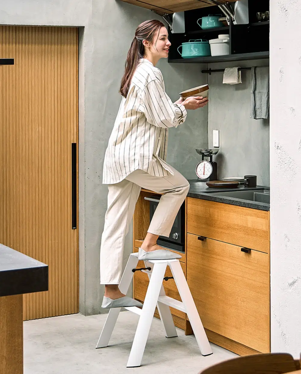 어딘가에는 손이 닿지 않는 사각지대가 존재하기 마련이다. 그럴 때마다 의자를 밟고 올라가자니 높이가 애매하고, 스툴에 의지하자니 영 불안하다. 의자를 잡아줄 사람도, 높은 곳의 물건을 덥석 꺼내줄 이도, 심지어 코어 근육까지 없는 내가 의지할 곳은 결국 이 사다리뿐이다. 가정용 사다리를 하나 살까 생각했다면, 다시 한 번 생각해보는 건 어떨까. 하세가와 루카노 사다리는 투박한 산업용 알루미늄이나 금방이라도 뒤집힐 것처럼 위태로운 플라스틱 사다리와는 차원이 다른 견고함을 보여주니까.