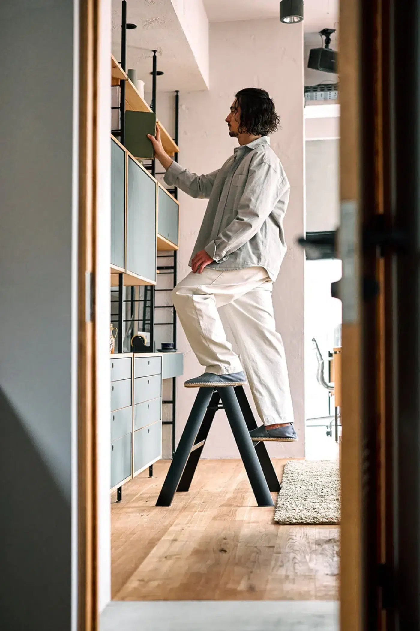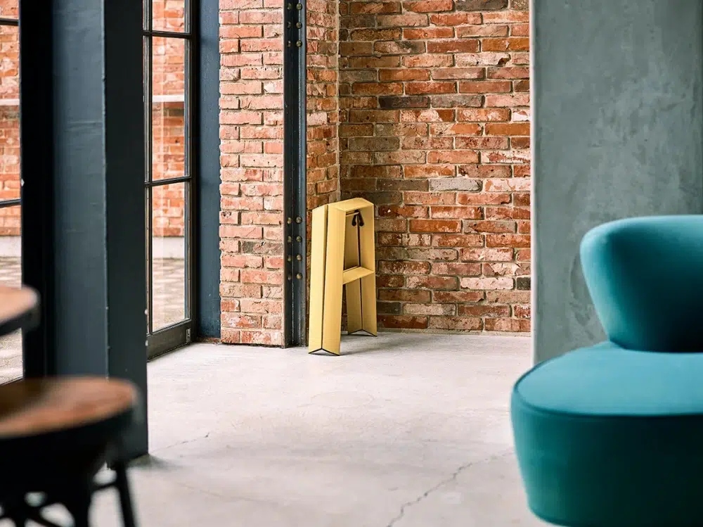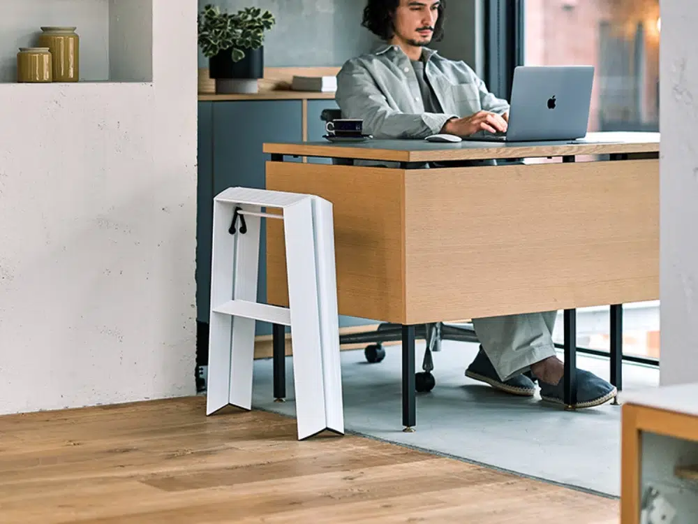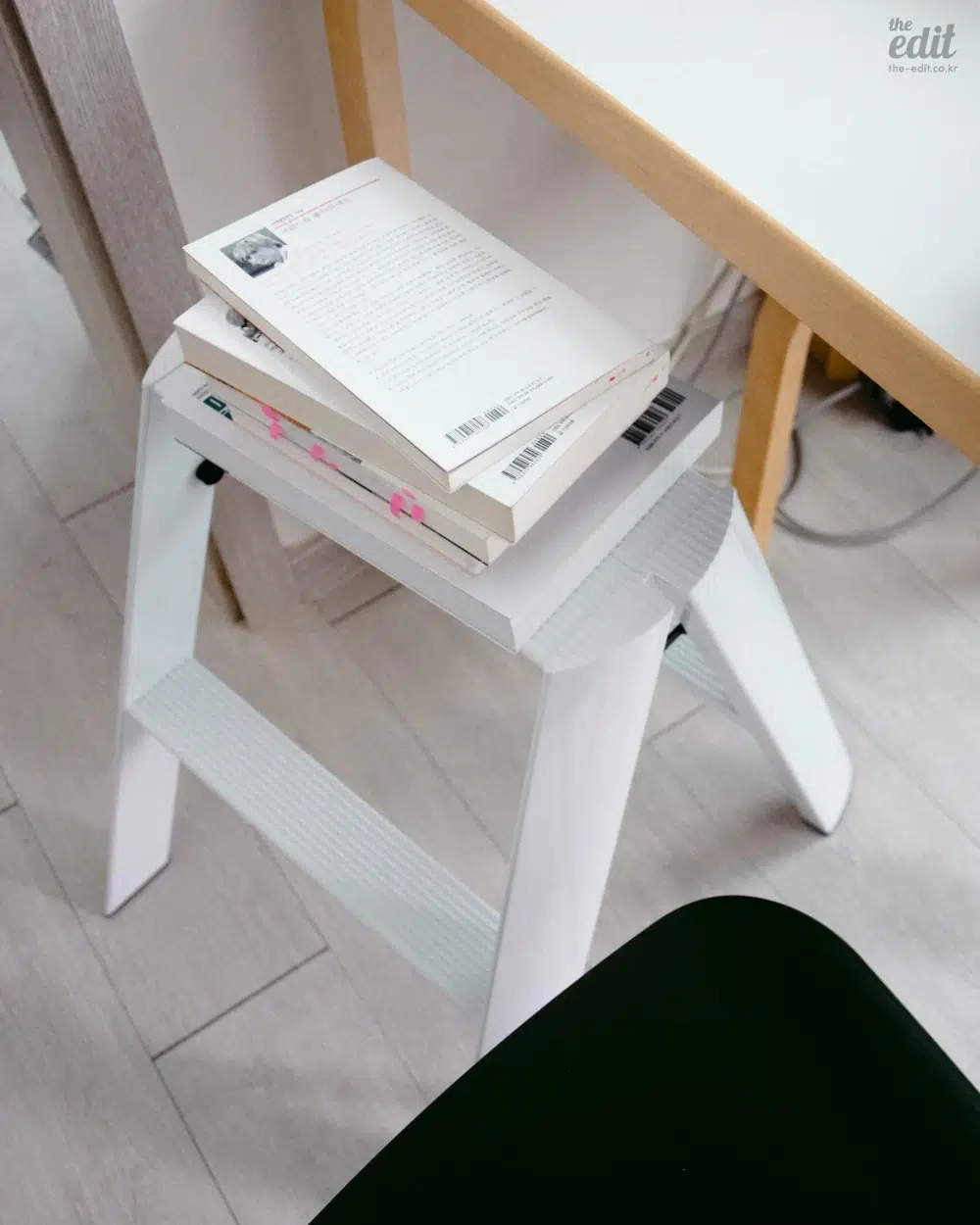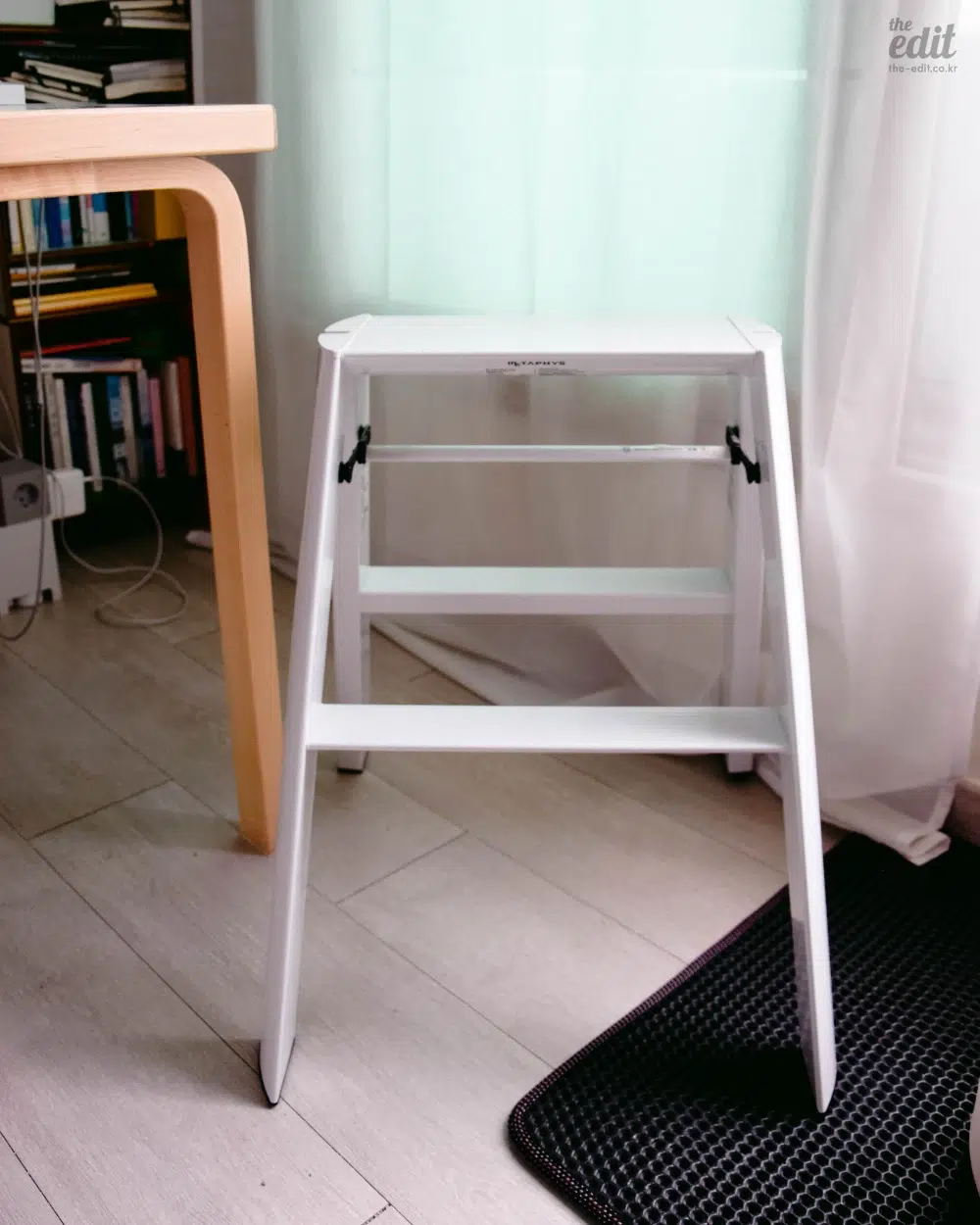 우선 가볍다. 한 손으로 가볍게 접고 펼 수 있을 만큼 편리하면서도 사용할 때 안정감이 압도적이다. 사다리 위에 올라서는 순간 전해지는 단단함 덕분에, 스툴 위에서 위태롭게 균형 잡던 과거의 기억은 미련 없이 지울 수 있다. 무엇보다 또 매력적인 건 벽에 기대지 않고도 스스로 서 있는 자립 구조라는 점! 그게 아니라면 벽에 기대 두거나 수납할 공간을 찾지 못해 애물단지가 되어 버릴 텐데 오히려 거실 한복판에 꺼내두고 자랑하고 싶을 만큼 유려하다. ‘숨기지 않아도 되는 사다리’라는 컨셉답게 공간의 무드를 해치지 않고 오브제처럼 스며든다. 개인적으로 일반 주거 공간에선 2단 사이즈가 가장 적절해 보이지만, 천장 높이나 용도에 맞게 선택하면 된다.