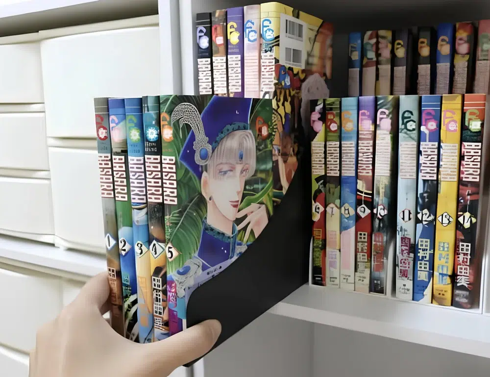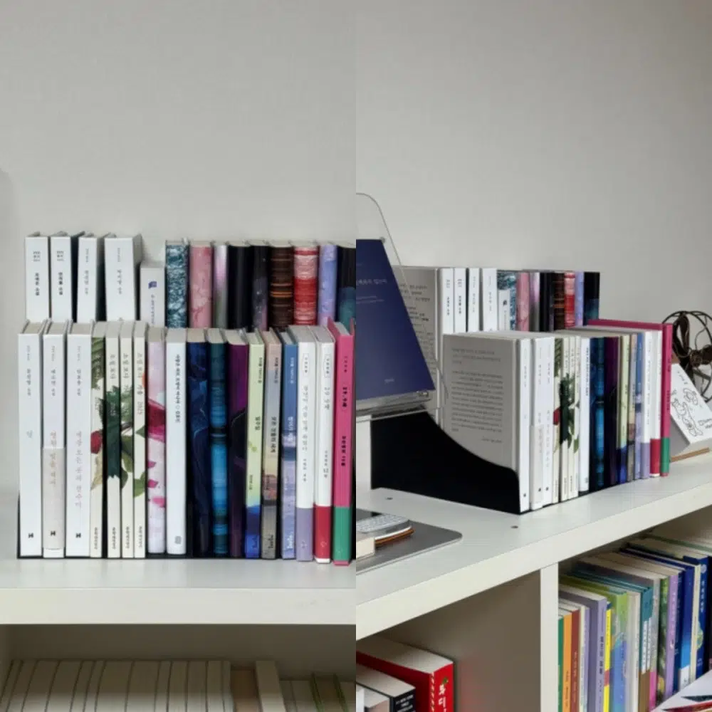 이 제품은 2단 구조로 설계되어 책꽂이 하나당 만화책 8-10권가량을 넉넉히 품는다. 특히 깊은 책장에서 진가를 발휘하는데, 계단식이라 뒤편에 숨어 있어도 책들의 제목이 한눈에 들어온다. 다시 읽고 싶을 땐 책꽂이만 가볍게 꺼내서 읽고 다시 슥 밀어 넣으면 끝이다. 꼭 만화책이 아니더라도 민음사 세계문학전집이나 문학동네 시집처럼 규격이 일정한 책들을 정돈하기에도 알맞다. 책을 위한 도구로 시작했지만, 알고 보면 화장품이나 소스 등을 쌓아두는 다용도 선반으로도 손색없다.