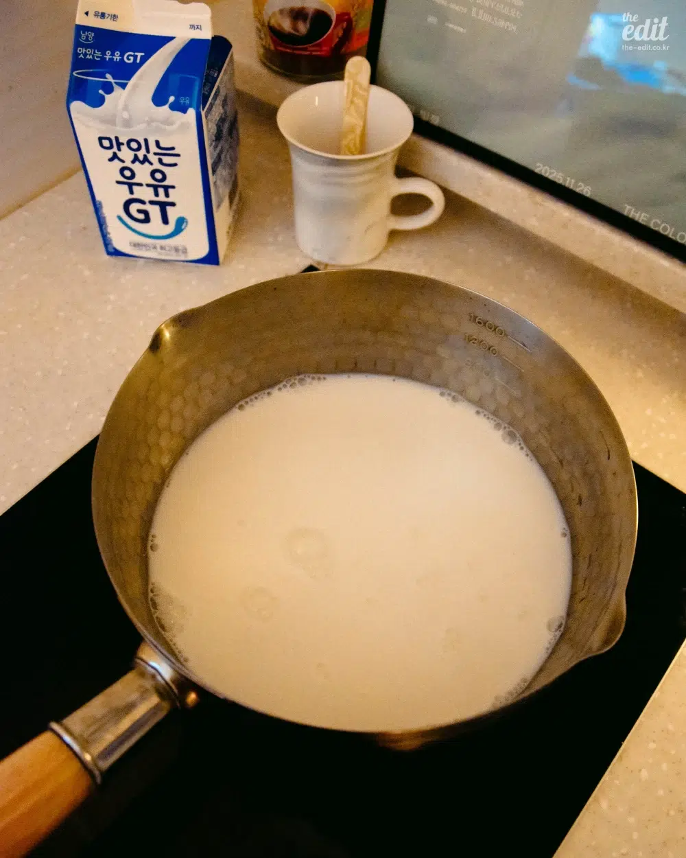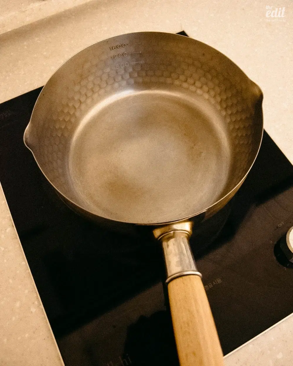 내가 선택한 사이즈는 20cm. 라면 3-4개는 거뜬히 끓여내는 넉넉한 크기다. 이 정도 체급은 되어야 국물 요리부터 원팬파스타, 채소찜 등의 레시피를 무리 없이 소화할 수 있다. 특히 면을 삶을 때 이 냄비의 진가가 드러나는데, 양옆에 물길이 있어 면수를 적당량 따라내기가 무척 간단하다. 또한 냄비 안쪽에 새겨진 눈금 덕분에 계량컵이 필요 없다. 라면 물 조절은 물론, 우유 비율이 중요한 밀크티를 끓여낼 때도 이 디테일의 덕을 본다. 양손으로 들어야 하는 양수냄비보다 한 손으로 슥 잡아 옮길 수 있는 편수 타입이라는 점, 손목에 무리가 가지 않을 만큼 가볍다는 점이 데일리 도구로서의 활용도를 극대화한다.