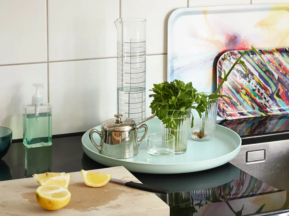 트레이를 단순히 음식을 나르는 주방 도구로만 정의하기엔 그 잠재력이 아깝다. 내게 트레이는 운반용이라기보다 흩어진 물건을 하나의 카테고리로 응축해 주는 시각적 울타리에 가깝다. 앞서 소개한 컬러 크레이트가 서랍 내부나 선반 위의 큼직한 질서를 잡는다면, 트레이는 손길이 가장 자주 닿는 곳에 나와 있는 물건들을 나열해 정돈하는 역할이다. 주방, 거실, 침대 어디든 놓이는 순간, 그곳이 제자리를 찾은 물건들의 안식처가 된다.