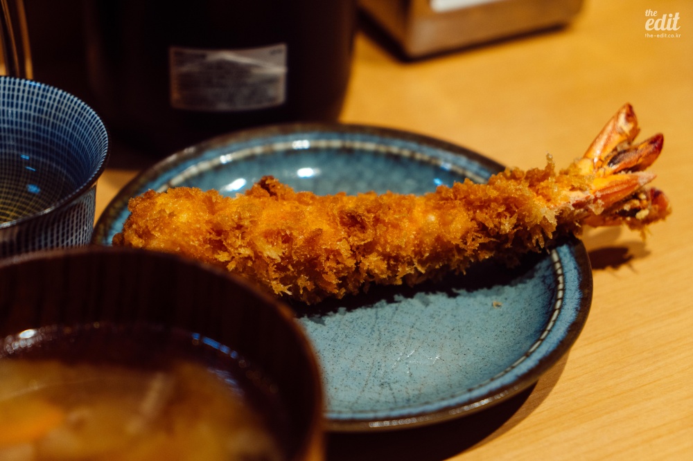 나는 1인석을 예약했고 바 자리로 안내 받았다. 1인석은 다소 비좁았다. 뒤로 사람이 지나가면 서로에게 미안해질 정도로 좁다. 조금이라도 의자를 더 당겨보려고 괜히 애쓰는 척하게 된다. 2인석을 예약한 사람들은 조금 더 넓은 곳에서 먹을 수 있다. 특별한 농장에서 키우는 흑돼지 품종을 쓰고 있다고 강조하는 안내문이 보였다. 나는 로스카츠에 히레를 추가해서 주문했다. 왼쪽과 오른쪽에는 모두 1인 남자 손님이 앉았다. 두 사람 모두 에비가츠를 하나씩 주문하길래 나도 냉큼 주문했다. “에비카츠, 히토츠 오네가이시마스”