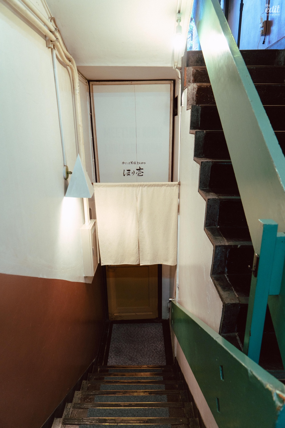 쿠로부타 돈가츠 호리이치는 예약제로 운영된다. 오후 2시 10분에 먹으러 갔을 때 이미 문 앞에는 ‘전석 예약’되었다는 안내문이 붙어 있었다. 예약제 식당이라 눈에 띌 필요가 없다. 눈에 잘 띄지 않는 간판이 걸려 있고, 매장은 한 층 내려가야 나온다. 문도 닫혀 있어서 ‘여기가 그 유명한 곳이 맞나’ 싶다. 의심하지 말고 문을 열면 된다.