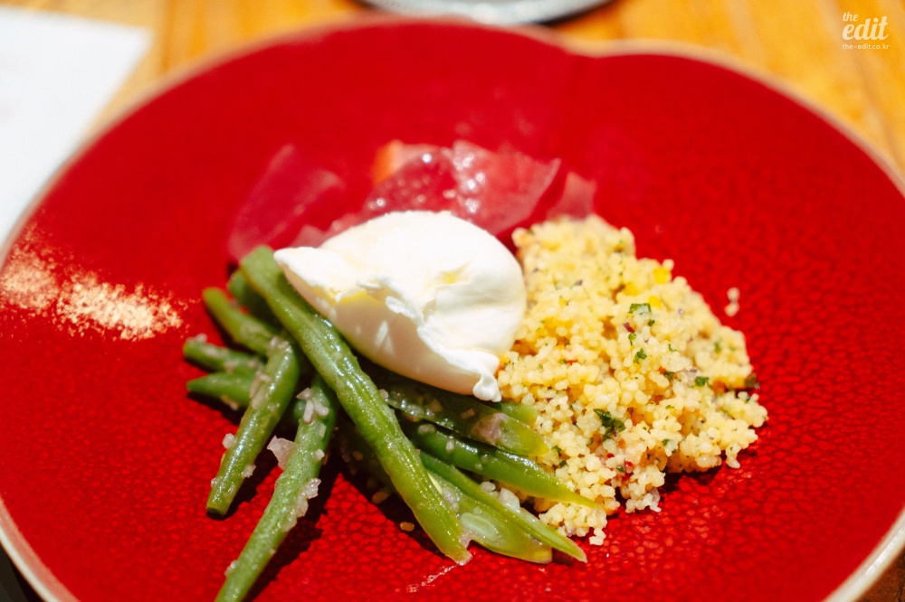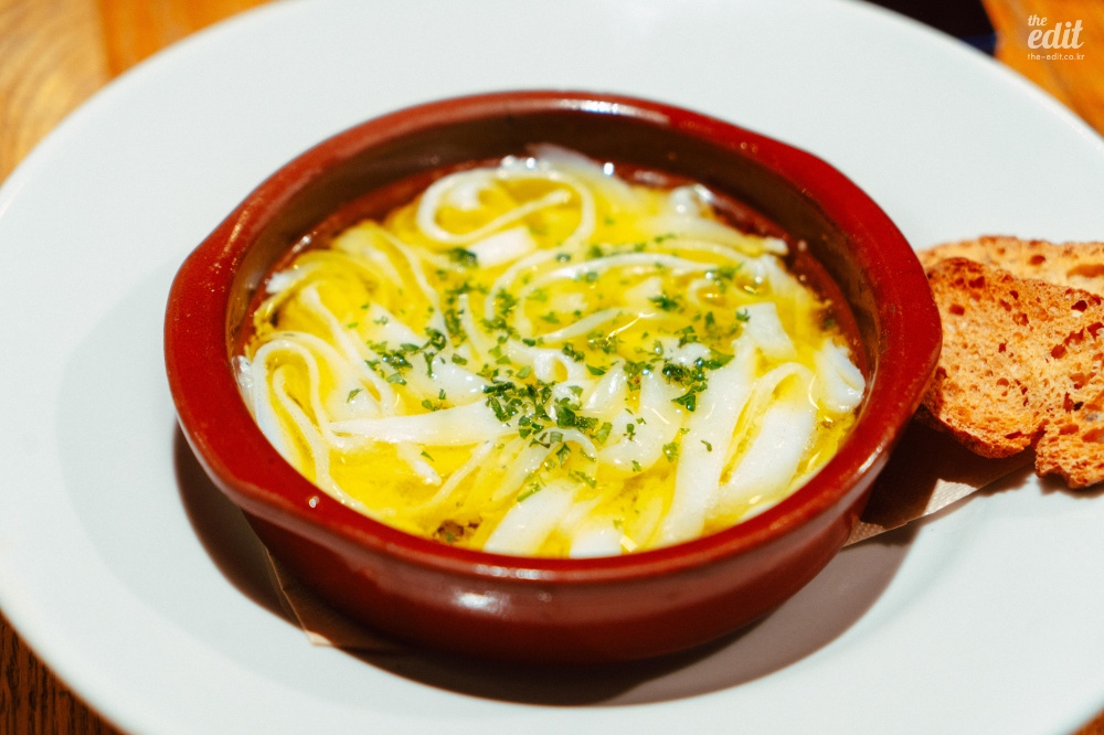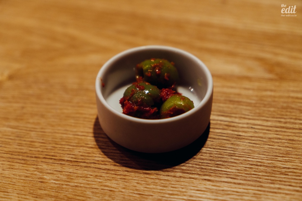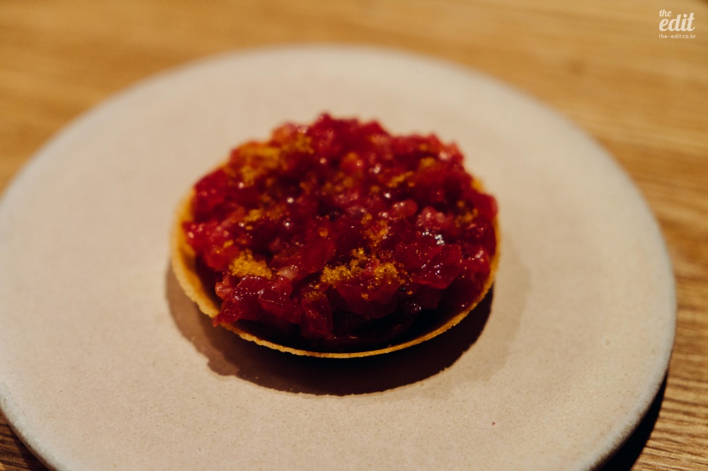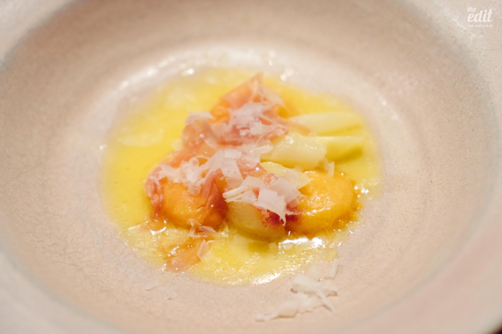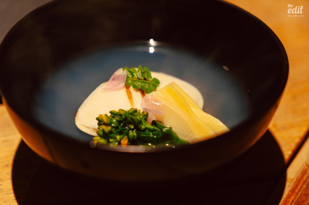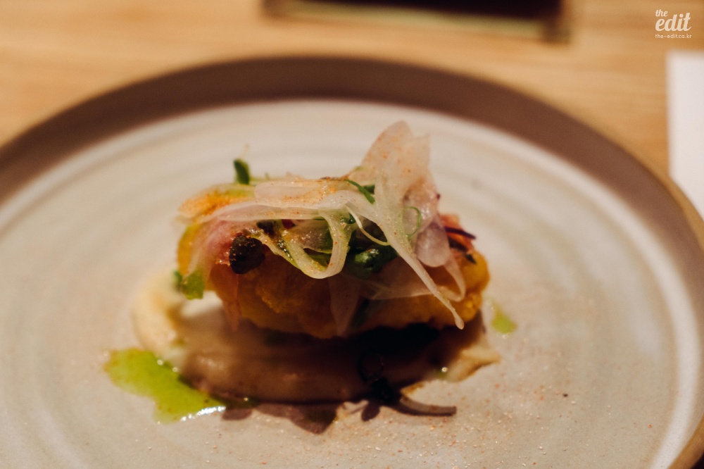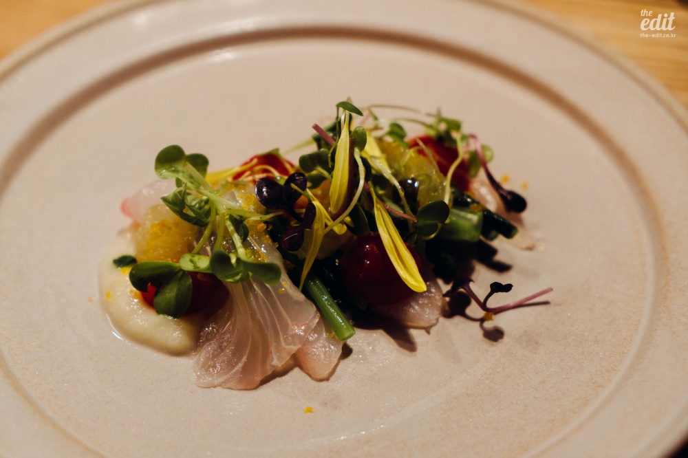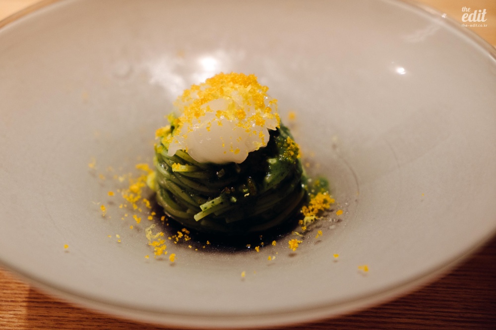 이 식당은 좀 특이했다. 좋은 뜻으로 특이했다. 프렌치 기반이지만 일본 전통 요리에서 쓰는 식재료를 적극적으로 활용한다는 점에서 특이했다. 처음 보는 식재료가 많아서 열심히 검색을 하며 먹었는데 ‘붕장어 유생’이라는 것도 있었다. 일본어로는 ‘노레소레’라고 한다. 겉보기엔 칼국수 면처럼 넓게 생겼는데 알고 보면 생선이었다. 미끌거리고 아무런 맛이 없다. 갈릭 오일에 푹 담겨 있어서 갈릭 오일을 배달하는 역할만 수행했다. 보통 파인다이닝의 첫번째 디시는 가벼운 한입거리로(아뮤즈부시) 시작하는 경우가 많은데 이것도 아뮤즈부시라고 해야 할까…? 첫 디시를 통해 “우리는 이런 음식을 합니다”라는 걸 보여주는 의도라고 생각하면 정확한 음식이기는 하다. 모든 코스가 이랬으니까.
