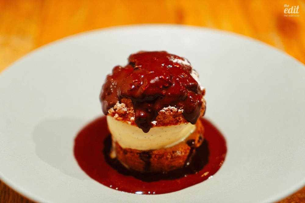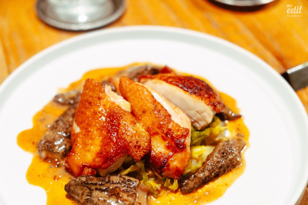 그 뒤로 나온 그라탕에는 연근, 버섯, 정소가 들어가 있어서 임팩트가 강했고(호불호를 탄다), 완두콩 스프는 완두콩의 풋내를 긍정적으로 살려서 맛있었다. 거의 배가 터질 것 같을 때 메인으로 로스트 치킨이 나왔다. 프레카세 스타일로 조리되어서 크림의 느끼함과 부드러움이 느껴지고, 바삭한 껍질의 대비가 매력적인 음식이었다. 전체적으로 양이 엄청 많았다. 리뷰에서도 양이 많다는 얘기가 많았는데, 파인다이닝에서 이렇게까지 푸짐하는 주는 경우는 정말 없긴 하다. 실험적인 재패니즈 프렌치 다이닝을 맛보고 싶다면 괜찮을 수도 있다.