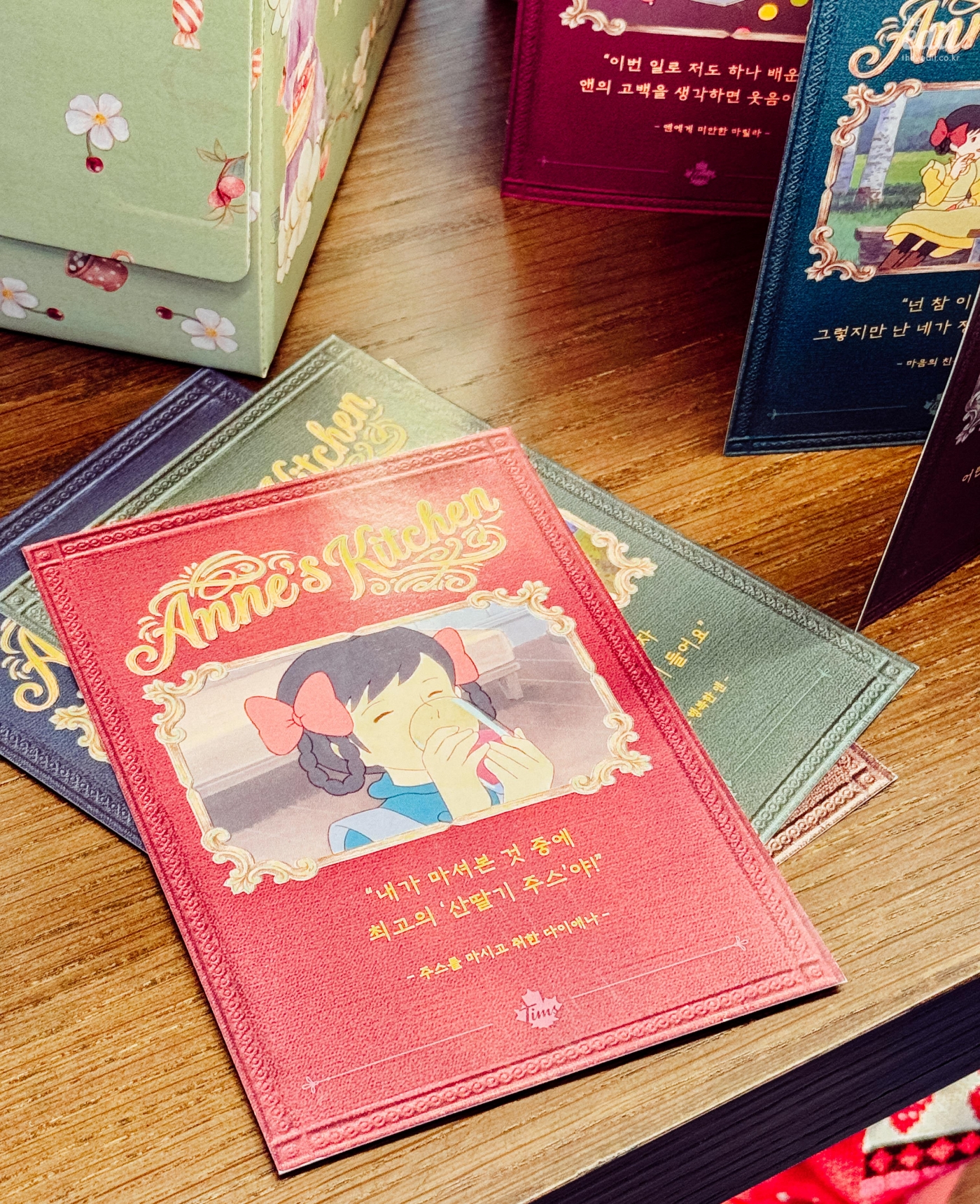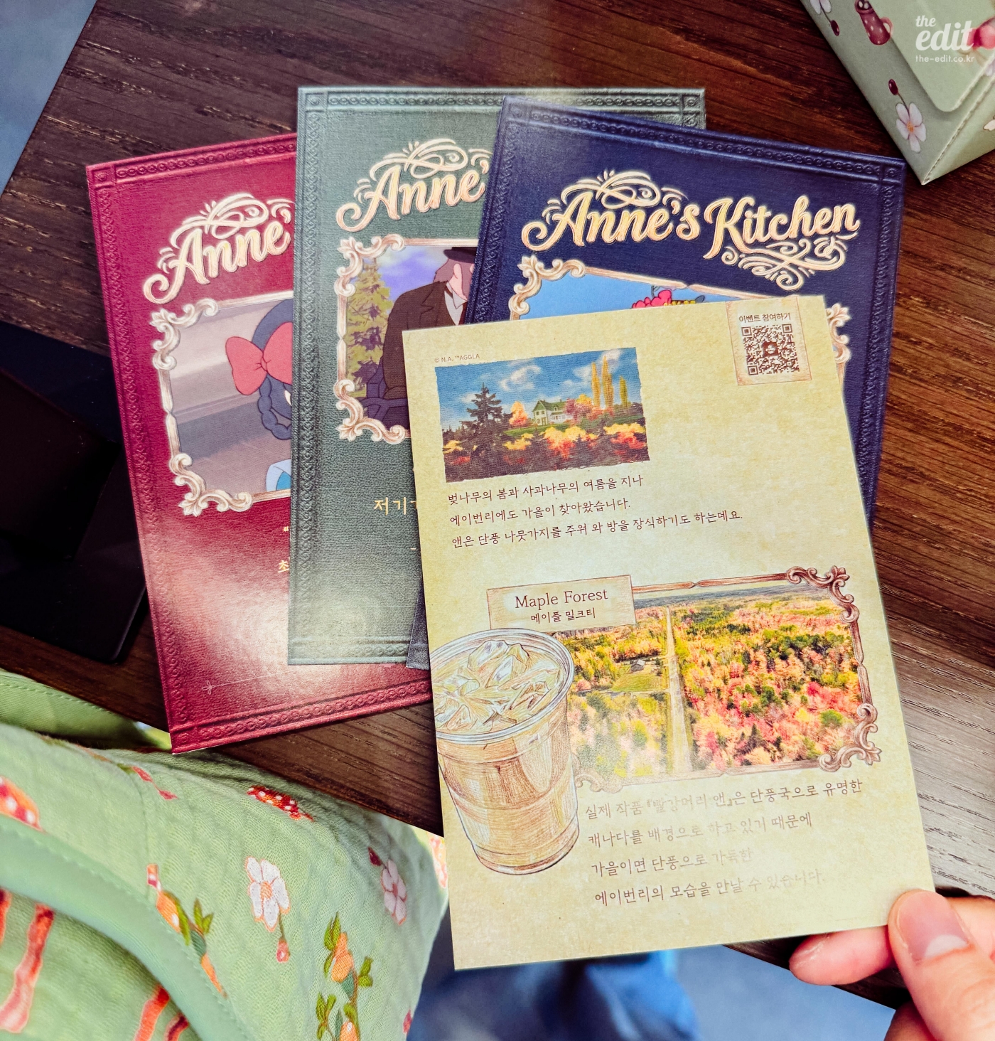 그 의도는 구매 시 받을 수 있는 메뉴 카드에서도 드러난다. 카드에는 영감을 받은 특정 장면과 인물 간의 관계가 함께 적혀 있다. 스토리텔링에 충실한 구성으로, 앤의 세계관을 맛과 경험으로 풀어낸 것. 덕분에 내가 고른 메뉴를 좀더 음미하고, 앤의 이야기에 귀를 기울 수 있다. 원작의 팬이라면 “뭘 좀 아는 사람이 만들었네” 하고 고개를 끄덕일 만하고, 앤을 처음 접한 고객이라면 작품에 대한 이해를 넓히며 메뉴를 경험하지 않을까. 적어도 후자에 속하는 나는 그랬다. 함께 주는 스티커를 조카에게 줄 때 아는 체할 수 있는 정보도 덤으로 얻었다(내 물건에 앤 스티커를 붙이기엔, 왠지 앤이 불쌍하니까).