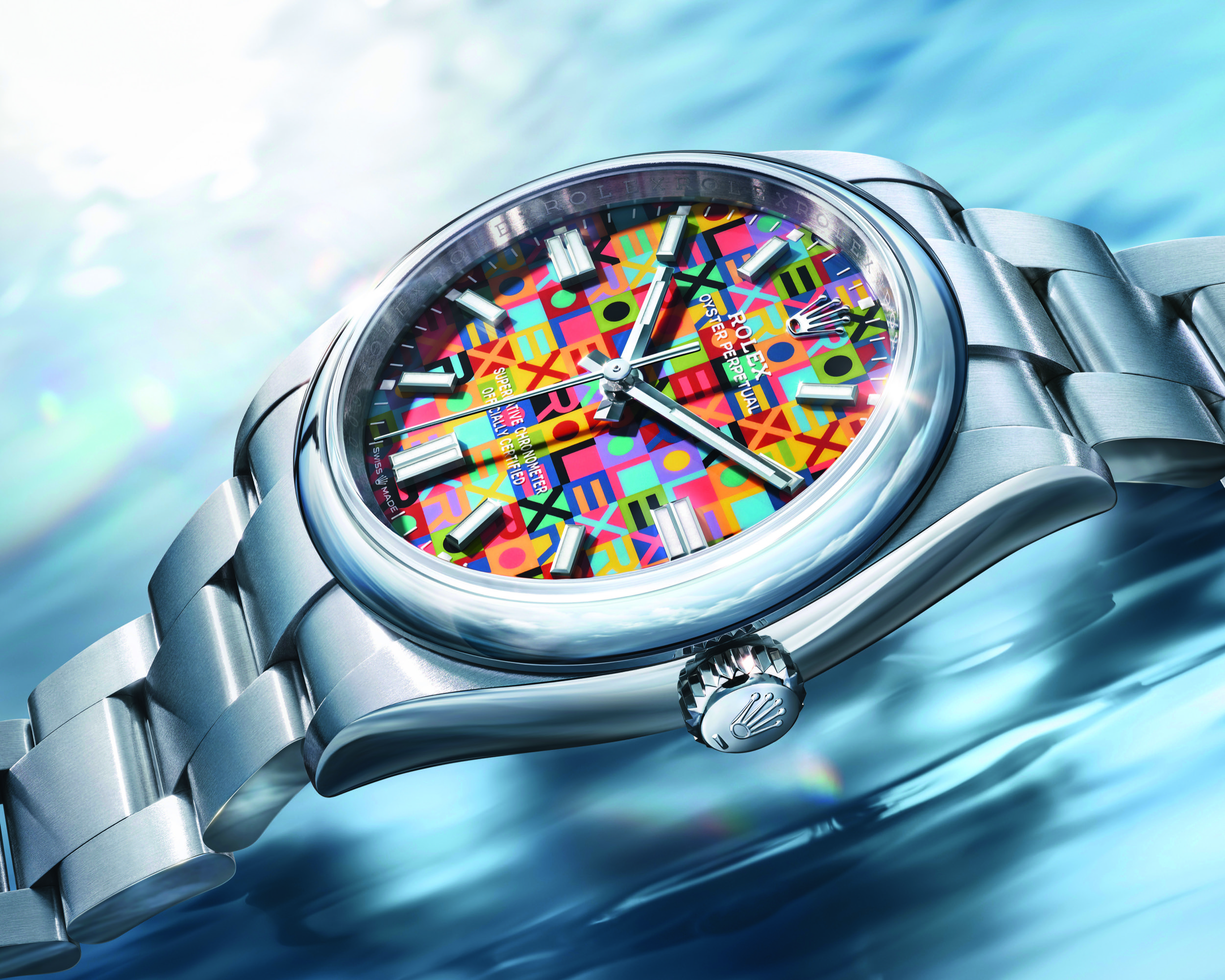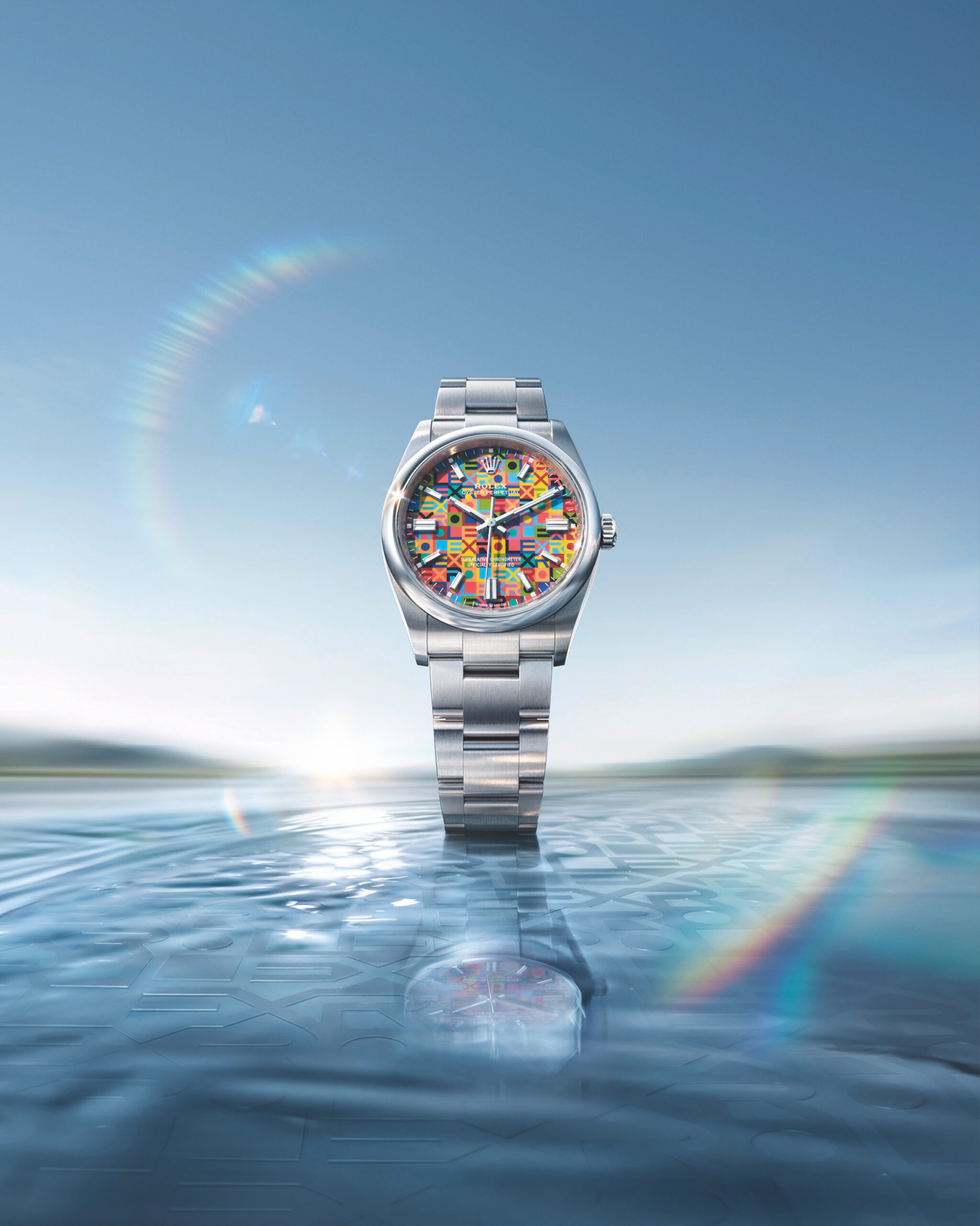 하나는 ‘주빌리’ 다이얼 레퍼런스입니다. 주빌리 다이얼은 특정 이벤트를 기념해 롤렉스가 내놓는 일종의 특별 다이얼입니다. 이번 오이스터 퍼페추얼의 주빌리 다이얼은 ROLEX라는 문자가 무려 10개의 색과 함께 다이얼에 새겨진, 어떻게 보면 롤렉스답지 않은 재밌는 요소를 볼 수 있어요. 이 10개의 색은 한 번에 한 개의 색만 인쇄해서 층층이 쌓아 올리는 구조라고 해요.