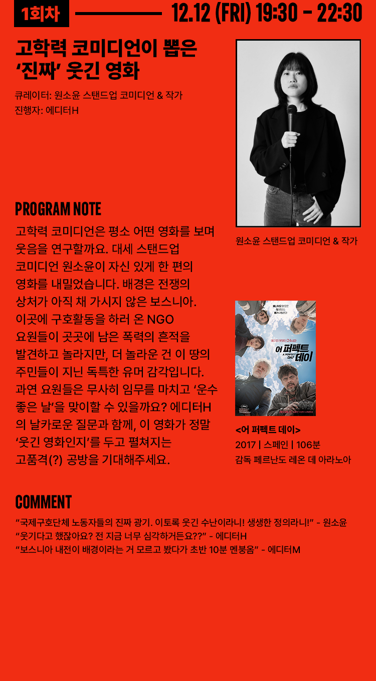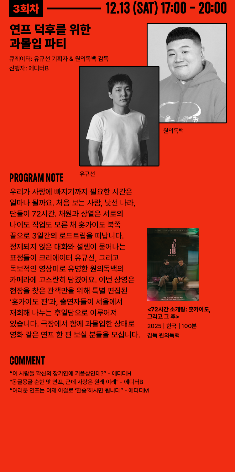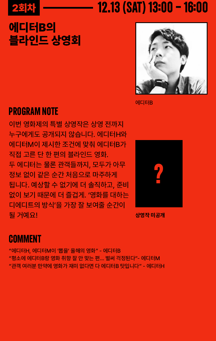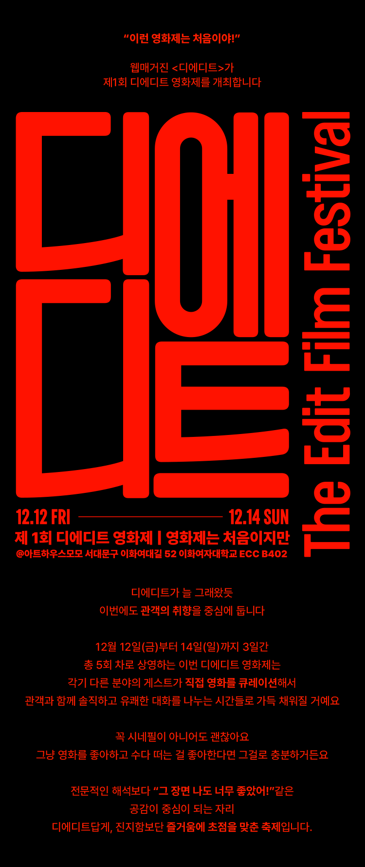 · 본 행사에서는 현장 스케치 및 영상 촬영이 진행됩니다. 촬영된 사진과 영상은 디에디트 관련 채널(유튜브, 인스타그램, 웹사이트 등)에 게재될 수 있으며, 영화제 참석 시 초상권 사용에 동의한 것으로 간주됩니다.