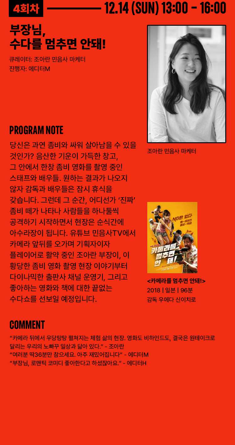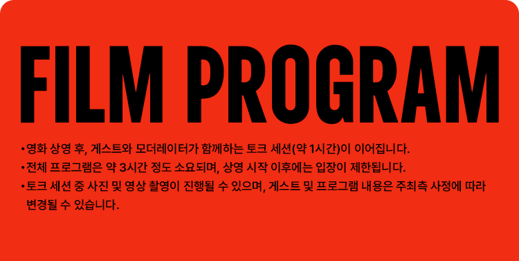 · 주최 측의 사정 또는 천재지변 등 부득이한 사유로 인해 프로그램의 일정, 장소, 상영작 등이 변경될 수 있습니다.